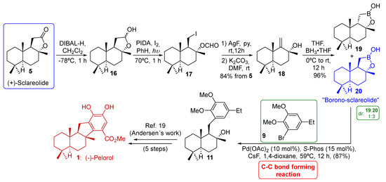 Baran and colleagues [24] reported the formal synthesis of the (−)-enantiomer of pelorol (1) from (+)-sclareolide (5) as a starting material. Their approach was based on the synthesis of a “borono-sclareolide” 20 as a common pluripotent intermediate widely used in the divergent synthesis of meroterpenoids. As shown in Scheme 3, the key intermediate 20 required the excision of carbon monoxide from (+)-sclareolide (5) and the introduction of B-OH in its place. The reduction in starting material 5 using diisobutylaluminium hydride (DIBAL-H) gave sclareal 16. The treatment of 16 under the C-C bond cleavage conditions of Suarez [27] delivered drimanal iodoformate 17. Then, a two-step dehydroiodination/hydrolysis procedure (AgF in pyridine followed by K2CO3 in MeOH) gave the natural exocyclic decalin 18 with an excellent 84% overall yield from 5. Compound 18 was synthesized on the decagram scale and was used without the need for technical chromatographic separation. The hydroboration of 18 with BH3 gave 19 and 20 as a mixture of diastereomers (19:20 = 1:3) at a 96% yield. Borono-sclareolide 20 was synthesized at the gram-scale and purified by column chromatography. This compound is a versatile terpene donor, which can be used as a partner of aryl bromides in Suzuki coupling reactions for the preparation of meroterpenoids. The C-C bond forming reaction between 20 and aryl bromide 9 gave the tertiary alcohol 11 at a 87% yield. As alcohol 11 is an advanced intermediate in Andersen’s synthesis of (−)-pelorol (1) (Scheme 2) [19], this procedure constitutes a formal synthesis of 1. In this way, the synthesis of 1 can be achieved in 11 steps (8.5% overall yield) from commercially available (+)-sclareolide (5).