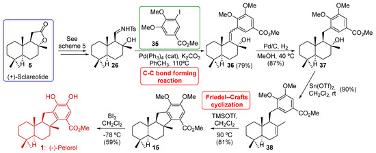 Two years later, the same research group published [26] an improved synthesis of 1 using the same synthetic strategy but varying the aryliodide partner (Scheme 6). In the synthesis discussed above, the methoxycarbonyl group was introduced into the aromatic ring after creating the cyclopentane ring C, since the deactivating effect of the ester group would make rather difficult the Friedel–Crafts cyclization. Wu and colleagues [26] found that TMSOTf is an extremely powerful additive, which can efficiently promote the Friedel–Crafts process even in when the aryl ring has electron-withdrawing groups, such as an ester. For that reason, they chose the aryliodide 35 as cross-coupling partner of the tosylhydrazone 26. The palladium catalyzed reaction afforded 36 as a mixture of diastereomers in a 79% combined yield. The hydrogenation of this mixture with H2 over Pd/C afforded compound 37 at a 87% yield. The stereoselective dehydroxylation of 37 was carried out with Sn(OTf)2, giving the trisubstituted alkene 38 at a 90% yield. The optimization of the cyclization of 38 into 15 in terms of Si4+ reagent, solvent, and temperature led to the conclusion that at high temperatures, TMSOTf was the most efficient promotor in dichloromethane, giving the tetracyclic compound 15 at a 81% yield. With the deprotection of the aryl methyl ethers in 15 by treatment with BI3, the synthesis of (−)-pelorol (1) [19] was completed in nine steps (19.5% overall yield) from (+)-sclareolide (5). The optimization of this modular strategy allows the shortening of the number of reaction steps, considerably improving the global yield, and represents an excellent methodology for the synthesis of multiple natural compounds. However, the high cost of the transition metal used to catalyze the coupling reaction between 26 and 35 limits the use of this synthetic route.
