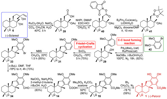 More recently, in 2024, Li and colleagues [20] reported an efficient synthesis of marine (−)-pelorol (1) from the inexpensive starting material (−)-sclareol (6). The key step was a Suzuki coupling of drimanyl Bpin 41 and arylbromide 42. As shown in Scheme 7, drimanyl Bpin 41 can be generated in three steps from 6 through a degradative sequence of reactions, which includes a cascade oxidative process of (−)-sclareol (6) with RuCl3·3H2O to yield homodrimanic acid 39. This acid can be converted to redox-active homodrimanyl-N-hydroxyphalimide ester 40 with N-hydroxyphthalimide (NHPT), and finally Cu-catalyzed decarboxylative borylation of 40 gives the desirable drimanyl Bpin 41. This intermediate was prepared at a 27.5% overall yield, after the flash-column chromatography purification of the intermediates, or at a 25% overall yield, after the solvent partitioning/aqueous wash workup of the crude residues of the three steps. The C-C bond formation reaction by Suzuki coupling between drimanyl Bpin 41 and 1-bromo-2,3-dimethoxybenzene 42 gave the key intermediate 29 at a 92% yield. The aromatic derivative 42 was obtained from 3-bromocathecol at a 91% yield. Subsequent Friedel–Crafts-type cyclization of the key intermediate 29 with SnCl4 at −78 °C gave the tetracyclic indane-fused decalin drimane 31 at a 75% yield with the desired diastereoselectivity. The introduction of formaldehyde in the aromatic ring was achieved through a two-step bromination- and lithium–halogen exchange-promoted formylation. Thus, when compound 31 was treated with NBS, the bromine derivative 32 was formed (95% yield). The reaction of 32 with n-BuLi and N,N-dimethyl formamide gave aldehyde 34 at a 73% yield. The subsequent Pinnick oxidation [29] of 34 followed by esterification gave methylated pelorol 14 in two steps (80% overall yield). Finally, the demethylation of product 15, previously reported by Andersen and colleagues [19], formed (−)-pelorol (1) with a 59% yield. The formal synthesis of (−)-pelorol (1) was completed in 10 steps, with a 5.6% overall yield.