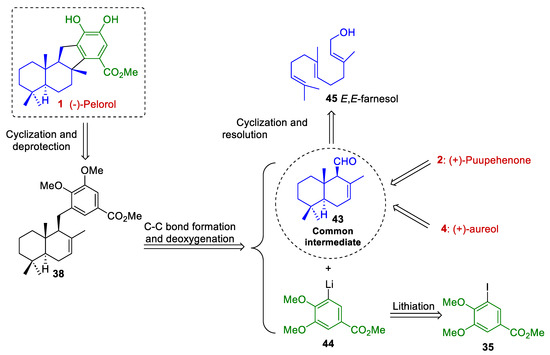 However, despite all the advances made, we think that a general strategy for (−)-pelorol (1) and analogues in a concise and divergent way is still desirable. In this section, based on our personal experience in the synthesis of natural compounds [30,31,32,33,34,35,36,37] and on the antecedents discussed in Section 2, we propose a retrosynthetic analysis of 1 in six steps, using the common synthetic intermediate 43 as the starting material. This aldehyde 43 could allow the divergent synthesis of meroterpenoids such as (−)-pelorol (1), (+)-puupehenone (2) [38], and (+)-aureol (4) using procedures previously reported by us (Scheme 8) [36,37,38,39,40].