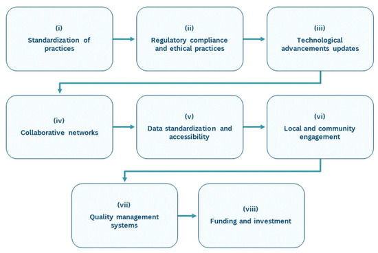 Creating and managing an ABR requires expertise, specialized personnel, and advanced technological and biochemical methods. ABRs collect, process, store, and distribute biomaterials, such as DNA, RNA, proteins, enzymes, biopolymers, and natural products from various sources, including natural history collections, bioprospecting results, and research activities. The establishment and sustainable operation of ABRs are critical for addressing the ongoing loss of aquatic biodiversity and supporting scientific, economic, and environmental goals. By implementing standardized practices, complying with regulations, embracing technological advancements, fostering collaboration, and engaging local communities, ABRs can significantly contribute to conservation efforts and biotechnological innovation. These repositories protect invaluable genetic resources and promote sustainable development and public health, highlighting their multifaceted importance in today’s world. For sustainable development and the maintenance of ABRs, key points for its successful implementation are suggested (Figure 2): (i) The standardization of practices—developing and implementing standardized protocols for the collection, storage, processing, and distribution of biospecimens can enhance the reliability and reproducibility of research, as recommended in stages 1, 2, 4 and 5. Furthermore, adopting ISBER’s Best Practices and creating comprehensive guidelines specific to ABRs can address inconsistencies. (ii) Regulatory compliance and ethical practices—ensuring compliance with international agreements, such as the Nagoya Protocol, ABS, and national regulations outlined in stages 1 and 7, is crucial. This involves understanding and adhering to legislation on genetic resource sharing, which handbooks like the EMBRC guide can also facilitate. (iii) Technological advancements updates—investing in new technologies for genomic sequencing, data management, and biomaterial preservation, as suggested in stages 2, 3, 4 and 5, can improve the efficiency and effectiveness of ABRs. These advancements can help in the rapid identification and processing of biospecimens. (iv) Collaborative networks—establishing and participating in networks can foster collaboration, knowledge exchange, and resource sharing among researchers, policymakers, and industry stakeholders. This enhances the collective ability to address biodiversity loss and environmental challenges. (v) Data standardization and accessibility—creating comprehensive databases and metadata platforms for genomic and ecological data (stage 6—digitalization of biospecimens and compounds) can improve data discoverability and utility. Ensuring that data are accessible to researchers globally via open access and open science supports collaborative research and conservation efforts. (vi) Local and community engagement—engaging local communities in conservation and biorepository activities can enhance public awareness and support biodiversity preservation. Community involvement in monitoring and managing local ecosystems can provide valuable data and strengthen conservation initiatives. (vii) Quality management systems—implementing robust quality management systems that include quality assurance and control measures ensures the integrity and security of biospecimens and data. Regular validation and qualification of instruments and methods are essential components of these systems. (viii) Funding and investment—securing funding for the establishment of sustainable ABRs is crucial. This can be achieved through public and private investments, grants, and partnerships with industry stakeholders who benefit from the biotechnological applications of aquatic biomaterials.