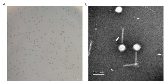 Phage morphology was observed using a JEM-2100 transmission electron microscope (JEOL, Tokyo, Japan) at an acceleration voltage of 80 kV. To prepare the samples for observation, 20 μL of high-titer phage concentrate was plated on 200-mesh formvar-coated copper electron microscope grids and allowed to absorb for 10 min, then negatively stained with 1% phosphotungstic acid for 1 min, followed by air drying for 10 min. The size of phage particles was measured from at least five TEM images using ImageJ software (V1.8.0) [51].