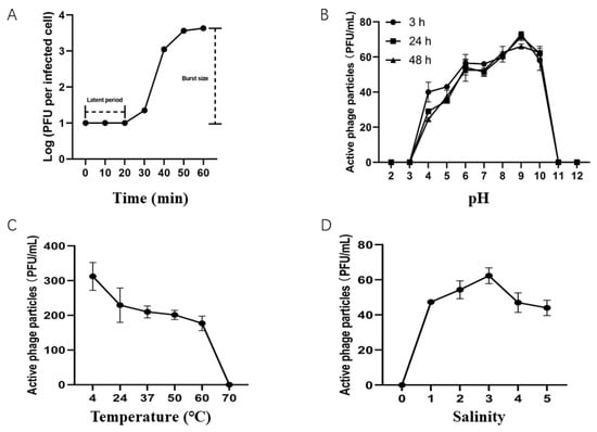 Biological properties of phage vB_VpaM_XM1. (A) One-step growth curve of phage vB_VpaM_XM1. (B) pH stability curve of phage vB_VpaM_XM1. (C) Stability of phage vB_VpaM_XM1 in different temperatures. (D) Stability of phage vB_VpaM_XM1 in different salinity. The data shown are average values from triplicate experiments, and error bars indicate standard deviations.
