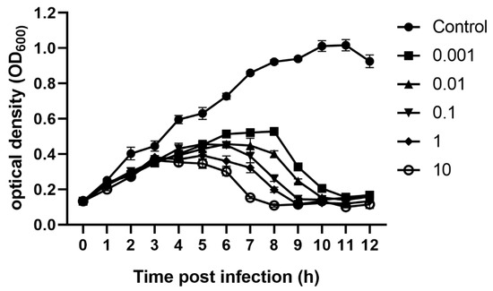 Inhibition curves of V. parahaemolyticus by phage vB_VpaM_XM1 at various MOIs (0.001, 0.01, 0.1, 1, and 10).
