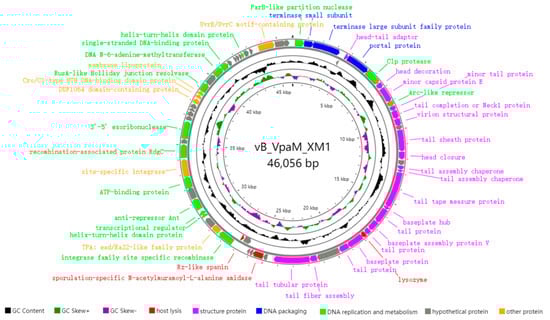 Genome analyses revealed that Phage vB_VpaM_XM1 (Accession: PP580404) is a double-stranded DNA virus belonging to the Duplodnaviria realm in the ICTV. Its genome size is 46,056 bp with a total G + C content of 42.51%, containing 69 predicted open reading frames (ORFs). The size of XM1 protein-coding sequences (CDSs) ranges from 51 to 825 amino acid residues (208 on average). Among the 69 ORFs, 66 are transcribed in the forward direction, while the other 3 (i.e., ORF4, ORF35, and ORF36) are transcribed in the reverse direction. The 69 predicted genes primarily encode viral structure proteins and proteins for DNA packaging, DNA metabolism and replication, and host lysis (Figure 4). Nearly two-thirds of the predicted genes (45/69) can be assigned functions according to their homology to known sequences of other phages. Concretely speaking, 19 predicted genes (ORF5, ORF8, ORF9, ORF11, ORF12, ORF13, ORF15, ORF16, ORF18, ORF19, ORF20, ORF21, ORF22, ORF23, ORF24, ORF26, ORF27, ORF29, and ORF30) are related to viral structure proteins, 3 predicted genes (ORF2, ORF3, and ORF6) are associated with DNA packaging, and 14 predicted genes (ORF1, ORF7, ORF10, ORF37, ORF40, ORF41, ORF42, ORF44, ORF46, ORF48, ORF56, ORF58, ORF59, and ORF64) are connected with DNA replication and metabolism.