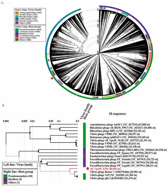 Phylogenetic analyses of phage vB_VpaM_XM1. (A) A circular proteomic tree constructed with phage vB_VpaM_XM1 and other phage genomic sequences using VipTree. (B) The viral proteomic tree, including vB_VpaM_XM1 and its 17 nearest phage relatives. The phages selected were a part of a rectangular tree of the whole genome. The left color line indicates the viral taxonomic families (the left color line is blank because there is no specific virus family for these viruses), and the right color line indicates the host groups.