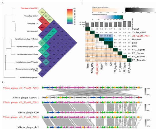 Comparative genomic analyses of phage vB_VpaM_XM1. (A) Genome-wide tree based on the average nucleotide identity (ANI) from 10 phages. Ten phages were selected based on the phages that showed the closest relationships to vB_VpaM_XM1 in the evolutionary tree in Figure 5. (B) VIRIDIC-generated heatmap incorporating intergenomic similarity values (right half) and alignment indicators (left half and top annotation). (C) Genome organization and comparisons of phage vB_VpaM_XM1 with Vibrio phage Rostov 7, Vibrio phage X29, and Vibrio phage phi2. ORFs are depicted by leftward- or rightward-oriented arrows according to the direction of transcription. Each color indicates a putative function, including host lysis (red), DNA packaging (blue), DNA replication and metabolism (green), structure protein (purple), other protein (orange), or hypothetical protein (gray).