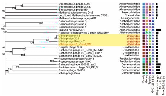 Local details of the Genome BLAST distance phylogeny (GBDP) tree constructed for Vibrio phages XM1, Rostov 7, X29, and phi 2 and 154 other viruses representing all the 66 known families in the realm Duplodnaviria. The truncated phylogenetic tree shows that vibrio phages XM1, Rostov 7, X29, and phi 2 are phylogenetically grouped and form a unique viral cluster unaffiliated with any known viral families in Duplodnaviria. The new phage family is tentatively named Weiviridae. The complete GBDP tree is shown in Supplementary Figure S1. Numbers at the nodes are GBDP pseudo-bootstrap values (100 replications and values > 50%). The different colors and shapes represent different Family, Genus, Species and G + C content.