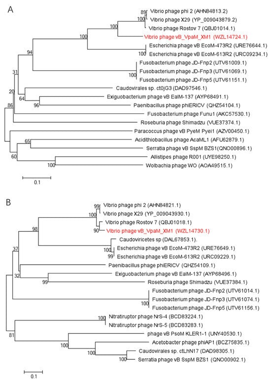 Neighbor-joining phylogenetic trees of phage vB_VpaM_XM1. (A) Phylogenetic tree based on the amino acid sequence of the terminase large subunit. (B) Phylogenetic tree based on the major capsid protein, showing the relationships between phage vB_VpaM_XM1 and other nearest phages.