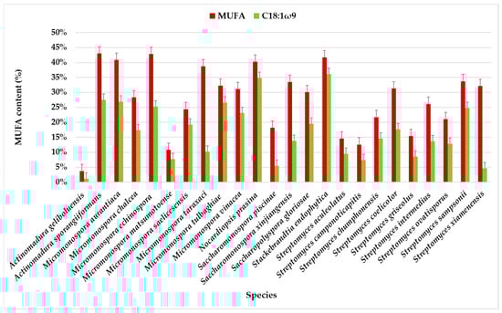 The chromatographic analysis identified eight MUFAs, with C18:1ω9 being the most abundant, followed by C16:1ω7. C18:1ω9 accounted for more than half of the identified MUFAs in the species, except for Streptomyces xiamenensis, Micromonospora taraxaci, Saccharomonospora xinjiangensis, Saccharomonospora piscinae, and Actinomadura geliboluensis. The lowest content of C18:1ω9 (1.20%) was found in Actinomadura geliboluensis (Figure 3), consistent with a previous study where actinomycetes were isolated from soil [49]. The predominance of C18:1ω9 in Stackebrandtia endophytica (36.15%) and Nocardiopsis prasina (34.83%) contrasts with the previous study, where the content of C18:1ω9 in these species accounted for 2.40% [60] and 4.40% [61] of the total FAMEs, respectively. However, the high content of C18:1ω9 in Nocardiopsis prasina is consistent with the literature, as this genus is known to produce high levels of C18:1ω9 [62]. Conversely, Stackebrandtia endophytica is recognized for its high BCFA content [63]. Notably, a high content of C18:1ω9 (>25%) was also observed in Actinomadura sporangiiformans (27.53%), Micromonospora aurantiaca (26.97%), Micromonospora tulbaghiae (26.63%), and Micromonospora echinospora (25.32%), which has not been previously reported.