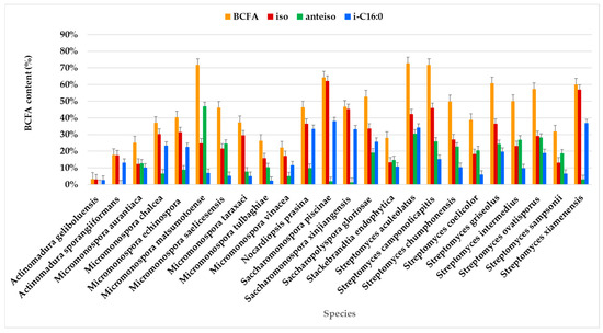 BCFAs are synthesized from branched-chain amino acids, specifically leucine, isoleucine, and valine, through a decarboxylation and elongation mechanism. This process produces iso-BCFAs with odd and even carbon chains and anteiso-BCFAs with odd carbon chains [42]. The high level of BCFAs produced by the actinomycete strains in this study suggest the potential for pharmaceutical applications, biofuel production, lubricants, and other industrial applications [115].
