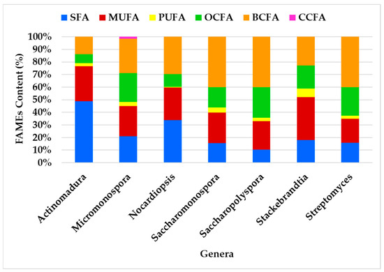 The FA class profiles vary among genera, with the most abundant FA being BCFA (41%), followed by MUFA (33%) and SFA (30%). BCFA was the most abundant FA in all genera except Actinomadura, where SFA predominates, and Stackebrandtia, where MUFA is most prevalent. The genera Streptomyces, Saccharopolyspora, and Saccharomonospora exhibited the most similar profiles (Figure 6). Despite some variability in FAME content among the genera, the overall distribution remains consistent. For instance, BCFAs and SFAs were identified as having the largest content, while OCFAs and MUFAs contribute significantly but to a lesser extent. OCFAs were identified across all genera, but they do not dominate in any of them. PUFAs are the minor fatty acids in all genera. CCFAs were exclusively observed in the Micromonospora genus.