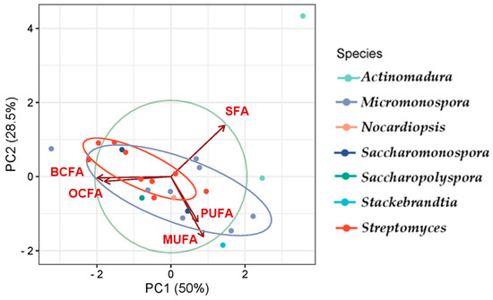Genera such as Streptomyces, Saccharopolyspora, and Saccharomonospora presented the greatest similarity in FA production, showing overlap to some extent, which corroborates the observations in Figure 6, and demonstrates the prevalence of BCFAs, MUFAs, and SFAs. Actinomadura is presented as an outliner, likely exhibiting unique features, suggesting it is more distinct compared to the others. Variables such as SFA show a strong influence along PC1, while BCFA and MUFA influence both PC1 and PC2. SFAs prevail in the genus Actinomadura, while the genus Stackebrandtia was the highest MUFA producer.