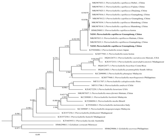 - Wang, X.; Yan, S.; Wang, Y.; Sun, Z.; Xia, B.; Wang, G. Study of the phylogeny and distribution of Pterocladiella (Pterocladiaceae, Rhodophyta) from China. Phycologia 2020, 59, 165–176. [Google Scholar] [CrossRef]