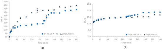 Degree of hydrolysis ((a), DH) and yield of the hydrolysate ((b), Yh) process of gilthead seabream carcass (GB) with Alcalase and Protana (AP and A + P) over time.