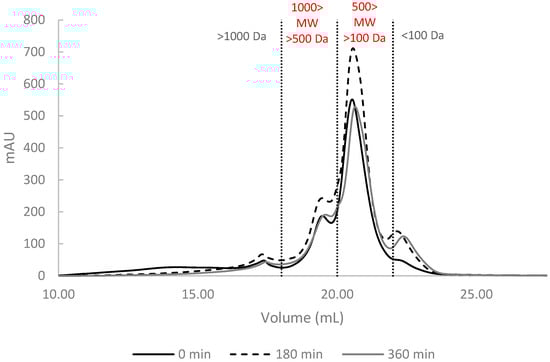 The Figure 2 illustrates the changes in GB hydrolysates as example, highlighting the progressive evolution of molecular mass distribution over time during enzymatic treatments with AP.