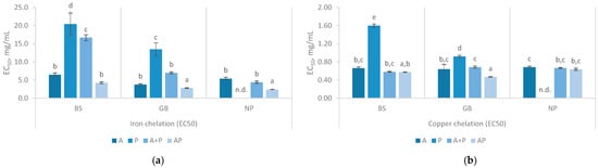 Iron (a) and cooper (b) chelation activity with different hydrolysates prepared with black scabbardfish heads and bones (BS), gilthead seabream carcass (GB) and Nile perch trimmings (NP) using various enzyme combinations: Alcalase (A), Protana (P), Alcalase followed by Protana (A + P), and Alcalase and Protana added simultaneously (AP). n.d. indicates values that could not be determined for the samples. The columns represent the mean values, and different letters reveal significant differences (p < 0.05).