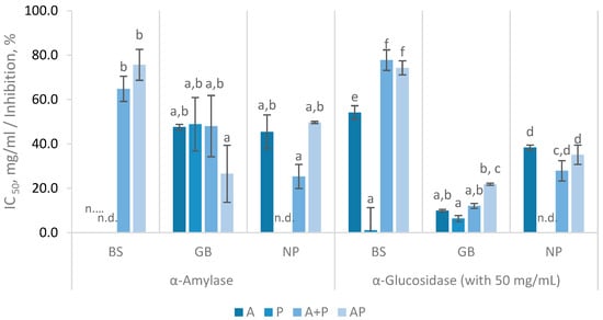 IC50 values for α-Amylase inhibitory activity and α-glucosidase inhibition percentages (%) with 50 mg/mL of FPH prepared from black scabbardfish heads and bones (BS), gilthead seabream carcass (GB) and Nile perch trimmings (NP) using various enzyme combinations: Alcalase (A), Protana (P), Alcalase followed by Protana (A + P), and Alcalase and Protana added simultaneously (AP). ‘n.d.’ indicates values that could not be determined for the samples. The columns represent the mean values, and different letters indicate significant differences (p < 0.05).