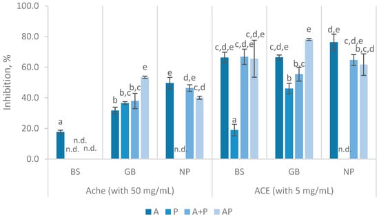 AChE inhibition percentages (%) with 50 mg/mL and ACE inhibition percentages (%) with 5 mg/mL of FPH prepared from black scabbardfish heads and bones (BS), gilthead seabream carcass (GB) and Nile perch trimmings (NP) using various enzyme combinations: Alcalase (A), Protana (P), Alcalase followed by Protana (A + P), and Alcalase and Protana added simultaneously (AP). ‘n.d.’ indicates values that could not be determined for the samples. The columns represent the mean values, and different letters significant differences (p < 0.05).