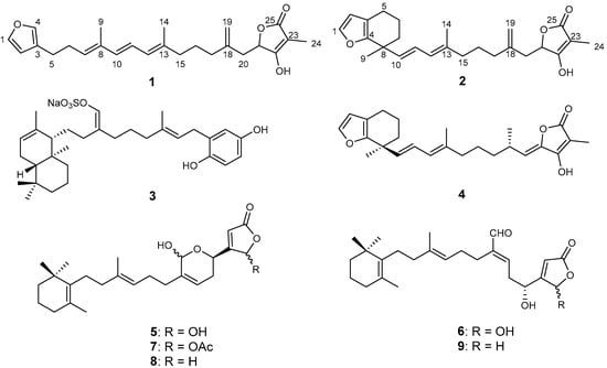 - Uddin, M.H.; Otsuka, M.; Muroi, T.; Ono, A.; Hanif, N.; Matsuda, S.; Higa, T.; Tanaka, J. Deoxymanoalides from the nudibranch Chromodoris willani. Chem. Pham. Bull. 2009, 57, 885–887. [Google Scholar] [CrossRef] [PubMed]