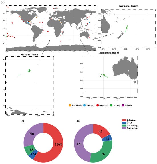 In total, 1299 metagenomic datasets were compiled from various deep-sea ecosystems globally (Figure 1A). A total of 2599 ARGs and 256 ARGs were identified by the SRB and ACB methods, respectively (Supplementary Data S2). Based on the SRB method, 1586 ARGs (61.1%) were related to β-lactams and the single-drug category (27.0%) (Figure 1B). Conversely, the single-drug category (47.8%) was the major category of ARGs predicted by the ACB method, followed by multidrug resistance ARGs (such as aminocoumarin antibiotics, diaminopyrimidine antibiotics, sulfonamide antibiotics, phenicol antibiotics, penem, and so on, which made up 30.0%) (Figure 1C).