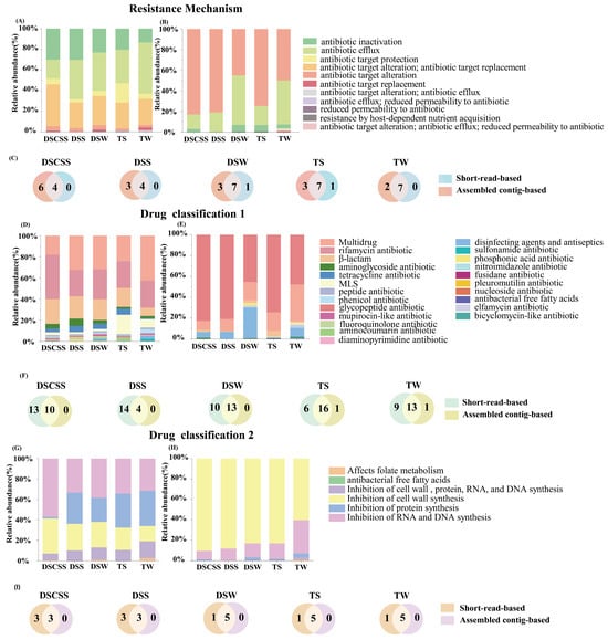 Based on the Comprehensive Antibiotic Resistance Database (CARD) [18], two ARG categories—resistance mechanism (RM) and drug class (DC)—were identified. RMs based on the SRB method contained antibiotic inactivation, antibiotic efflux, and antibiotic target alteration/replacement (Figure 2A). RMs based on the ACB method were predominantly antibiotic target alteration and antibiotic efflux (Figure 2B), with the least number of RM types in DSS (Figure 2C). About seven RM types by the SRB method and four RM types by the ACB method were commonly shared among all ecosystems (Supplementary Figure S1A).