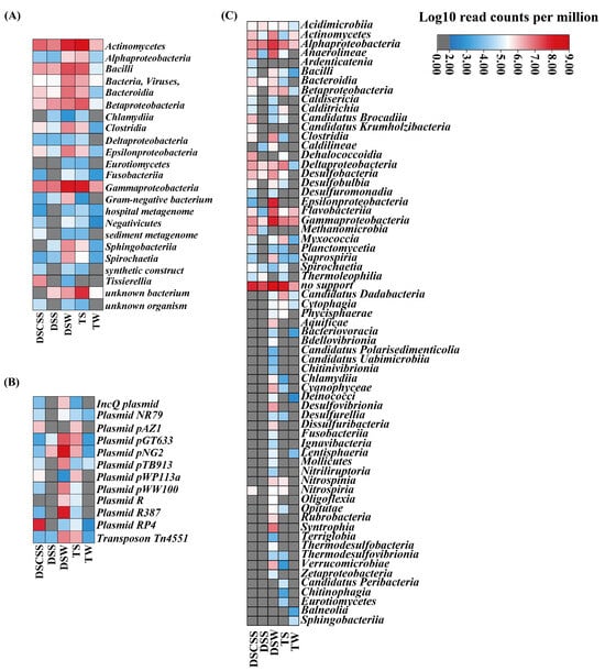 Heatmap showing the relative abundance of hosts and plasmids based on log10-transformed ARG data predicted by the SRB (A,B) and ACB (C) methods in different environments, respectively. Read counts per million is a metric used to normalize high-throughput sequencing data, primarily to convert differences in read counts between samples (e.g., different sequencing depths) into comparable data.