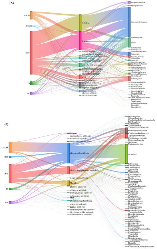 Sankey plots showing the relationship between ARG classes and their hosts by the SRB (A) and ACB (B) methods in different environments, respectively. The number in parentheses represents the number of host species in the notes in the environment. The wider the width of the flow band, the higher the proportion of ARGs in the corresponding environment or host.