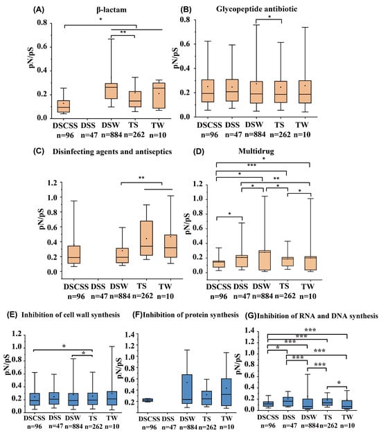 Boxplot of the ratio of nonsynonymous to synonymous substitutions (pN/pS) for ARGs related to β-lactam (A), glycopeptide (B), disinfecting agents and antiseptics (C), multidrug (D), inhibition of cell wall synthesis (E), inhibition of protein synthesis (F), and inhibition of RNA and DNA synthesis (G) in different environments. * p < 0.05, ** p < 0.01, *** p < 0.001.