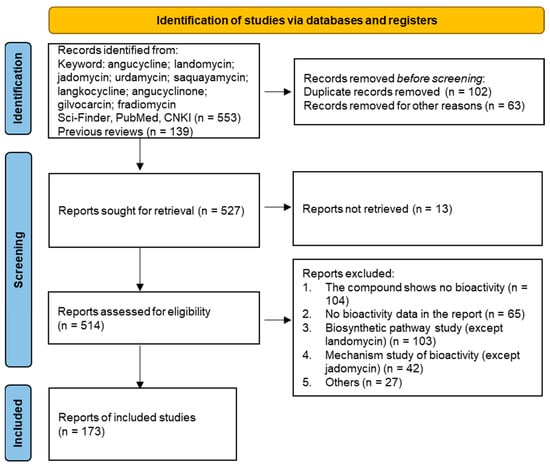 The search for and screening of angucyclines/angucyclinones with bioactivity were conducted under the guidance of Preferred Reporting Items for Systematic reviews and Meta-Analyses (PRISMA) statement [] (Figure 1). Cytotoxic activity with an IC50 value less than 10 μM, antibacterial or antifungal activity with an MIC value less than 128 μg/mL, and other activity that was comparable to or stronger than the positive control are considered as a bioactive compound.