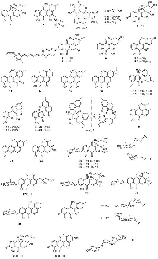 The research group of 23 also discovered 24, from S. pratensis KCB-132, with moderate activities against multiple resistant “ESKAPE” pathogens (E. faecium, S. aureus, K. pneumoniae, Acinetobacter baumannii, P. aeruginosa, and Enterobacter species); the MICs of 24 ranged within 3.1–21.4 μg/mL, comparable to the positive controls ampicillin, amikacin, and ciprofloxacin []. S. ardesiacus 156VN-095 was isolated from a sample collected near Nha Trang Bay, Vietnam, and the fermentation extract contained urdamycins W (25) and X (26), grincamycin U (27), as well as an analogue, urdamycin E (28). Compounds 25, 26, and 28 were cytotoxic to ACHN (renal adenocarcinoma cells), HCT-15, MDA-MB-231 (breast cancer cells), NCI-H23 (non-small-cell lung cancer cells), NUGC-3 (gastric cancer cells), and PC-3 (prostate cancer cells) with GI50 (50% growth inhibition concentration) values of 0.019–0.150 μM, comparable to those (0.140–0.162 μM) of Adriamycin. In addition, 25–27 displayed antibacterial activities against B. subtilis KCTC 1021, Micrococcus luteus KCTC 1915, and S. aureus KCTC 1927, and the MICs ranged from 8 to 64 µg/mL []. Marine-derived Streptomyces sp. BCC45596 collected from Sichang Island (5 m deep, Chonburi province, Thailand) generated C-glycosylated benz[α]anthraquinone urdamycinone E (29), urdamycinone G (30), dehydroxyaquayamycin (31), and urdamycin E (28). Compounds 29–31 displayed inhibition against KB (oral epidermoid cancer cells), MCF-7, NCI-H187 (retinoblastoma cells) and Vero (African green monkey kidney cells) (IC50 values = 0.092–15.46 μg/mL); M. tuberculosis (IC50 values = 3.13–12.50 μg/mL) as well as Plasmodium falciparum (IC50 values = 0.0534–22.93 μg/mL) []. Streptomyces sp. SCSIO 11594 was isolated from a 2403 m deep sediment sample collected from the South China Sea, and the fermentation broth contained marangucyclines A (32) and B (33). The ketose-containing compound 33 exhibited inhibition against A594 (non-small-cell lung cancer cells), CNE2 (parotid cyst cancer cells), HepG2, and MCF-7, and the IC50 values ranged from 0.24 to 0.56 μM; it also displayed selectivity between cancer cells and normal cells. Marangucyclines A (32) and B (33) also showed weak antibacterial activities against E. faecalis ATCC29212 (both MICs at 64 μg/mL) []. S. lusitanus SCSIO LR32 was isolated from a deep-sea sediment sample collected in the South China Sea, China. A-7884 (34) and grincamycin J (35), produced by SCSIO LR3, exhibited cytotoxic activities against human cancer cells MDA-MB-435 (melanoma), MDA-MB-231, NCI-H460, HCT-116 (colon cancer), and HepG2 as well as MCF-10A (normal breast epithelial cells) with IC50 values ranging from 0.4 to 6.9 µM. In addition, A-7884 (34) demonstrated antimicrobial activity against M. luteus, with an MIC value of 1.95 µg/mL [].