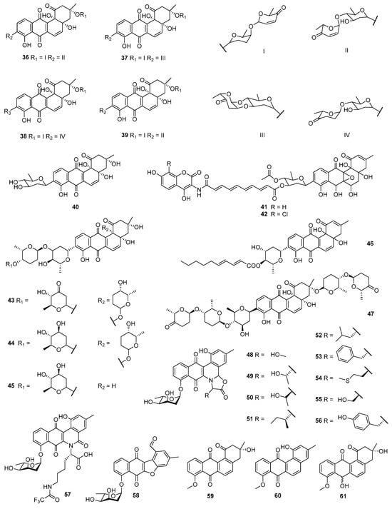 The fermentation of S. gilvotanarens NRRL 11382, a new species isolated from a soil sample collected in Kochi, Japan, led to the discovery of gilvocarcins V (5) and M (6). Both were bioactivated toward tumor cells such as sarcoma 180 (mouse malignant sarcoma cells) and P388. Mice treated with compound 5 lived significantly longer than control animals. Compounds 5 and 6 also showed inhibition against S. aureus ATCC 6538P and B. subtilis No. 10707, with MICs of 0.05/1.6 and 0.78/25 μg/mL, respectively []. Saquayamycins A–D (36–39) were produced by S. nodosus MH190-16F3, associated with a soil sample taken from tobacco growth areas (Kitakyushu, Japan), and could inhibit Adriamycin-sensitive (P388/S) and Adriamycin-resistant (P388/ADR) sublines of P388 in vitro, with IC50 values of 0.06–0.15 μg/mL. The LD50 (median lethal dose) by intraperitoneal injection of saquayamycins A (36) and B (37) in mice were 6.25–12.5 mg/kg. In addition, 36–39 exhibited antibacterial activities against S. aureus FDA209P, M. lysodeikticus IFO 3333, M. luteus PCI1001, and B. subtilis PCI 219 with MICs of 1.56–6.25 μg/mL [] (Figure 3). Further research revealed that saquayamycins A (36) and B (37) exhibited remarkable activities against L-1210 (mouse leukemia cells), A549, and HT-29 (IC50 values = 0.004, 0.2, and 0.06 μg/mL, respectively), and demonstrated distinct toxicity in vivo []. Aquayamycin (40) and Adriamycin (positive control) could also inhibit the aforementioned two cells with IC50 values at 2.0/2.2 and 0.01/0.55 μg/mL, respectively []. S. antibioticus Tü 6040 was isolated from a soil sample from Iguaguu, Argentina, and the mycelium extract contained the simocyclinones D4 (41) and D8 (42), both of which showed cytotoxicities and antibacterial activities, while the GI50s against HMO2 (human milk oligosaccharides) and MCF-7 cell lines ranged from 0.3 to 5.6 μM, better than 5-fluorouracil (positive control, GI50 = 1.2 and 50 μM). The MICs against B. brevis DSM30 were 30 and 10 μg/mL, respectively [,].
