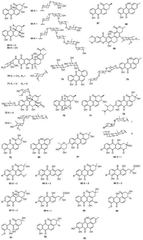 Langkocyclines A1–A3 (62–64) were obtained from the extract of Streptomyces sp. Acta 3034, which was associated with the rhizospheric soil of Clitorea sp. Compound 64 displayed inhibitory activities against HepG2 and NIH 3T3 (mouse embryonic fibroblast) cells, with IC50 values of 2.5–5.0 μM, while 62–64 showed inhibition toward B. subtilis, with IC50 values at 40.7, 4.07, and 2.17 μM, respectively [] (Figure 4). The fermentation of soil-derived Saccharopolyspora BCC 21906 (Chanthaburi, Thailand) led to the isolation of saccharosporones A (65) and B (66), as well as (+)-ochromycinone (67) and tetrangulol methyl ether (68). Compounds 65 and 66 exhibited cytotoxic activities against KB, MCF-7, and NCI-H187 cell lines with IC50 values ranging within 3.4–9.1µM. Compounds 65–68 showed growth inhibition against M. tuberculosis, with IC50 values of 76.2, 72.7, 40.8, and 19.7 µM, respectively []. Heterologous expression of two eDNA-derived KSβ sequences associated with the biosynthesis of (C24)-pradimicin and (C26)-xantholipin-type metabolites in Streptomyces salbus led to the isolation of calixanthomycin A (69) and the arenimycins C (70) and D (71), and all of them were cytotoxic toward HCT-116 cells, with respective IC50 values at 0.43 nM, 0.17 μM, and 2.8 μM. Meanwhile, 69–71 also could inhibit MRSA and B. subtilis RM125 with MICs of 0.0015–50 μg/mL []. The overexpression in S. chattanoogensis L10 (CGMCC 2644) of a pathway-specific activator gene under the constitutive ermE* promoter successfully triggered the expression of the angucycline biosynthetic genes and led to the discovery of chattamycins A (72) and B (73). Compound 72 was cytotoxic to MCF-7 (IC50 = 6.46 μM), while 73 showed inhibitory activities against MCF-7 (IC50 = 1.08 μM) and HepG2 (IC50 = 5.93 μM) cells. In addition, 73 exhibited activity against B. subtilis ATCC 67736 (IC50 = 102.59 μM) []. The method of site-directed mutagenesis led to the generation of ten mutants of S. chattanoogensis L10 (CGMCC 2644) with point mutations in the highly conserved region of rpsL (encoding the ribosomal protein S12) or rpoB (encoding the RNA polymerase β-subunit). L10/RpoB (H437Y) accumulated anthrachamycin (74), which was absent in the wild type. In the 2,2′-amino-di(2-ethyl-benzothiazoline sulfonic acid-6) ammonium salt (ABTS) free radical scavenging assay and the ferric ion reducing antioxidant power (FRAP) iron reduction assay, 74 showed antioxidant activity at 67.28 and 24.31 mg VCE/g LP, respectively [].