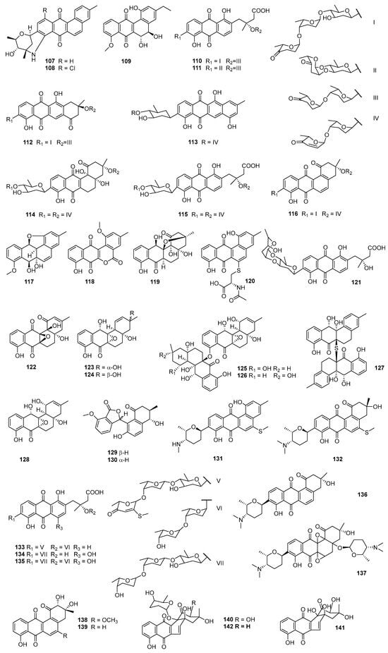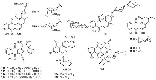 Kinamycins A–D (100–103), isolated from S. murayamaensis, have a highly unusual and potentially reactive diazo group. Kinamycins A (100) and C (102) showed IC50 values of 10 μM and 0.3 μM, respectively, against Chinese hamster ovary (CHO) cancer cells. Kinamycins A (100) and C (102) also could inhibit the catalytic decatenation activity of DNA topoisomerase IIα, but showed no activity as a topoisomerase II poison. Meanwhile, their inhibition of catalytic activity was not correlated with a cell growth inhibitory effect []. Kinamycins A–D (100–103) also showed antibacterial activities against Gram-positive bacteria []. 4′-acetylated-chrysomycins A (104) and B (105) were discovered during the screening for antitumor agents from the metabolites of actinomycetes, and both compounds showed high cytotoxicities toward most of the tested cancer cells, with IC50 values less than 10 ng/mL. Compound 104 showed strong anti-Gram-positive-bacterial activities toward MRSA and VRE, with MIC values of 0.5–2 μg/mL []. S. aureofaciens CCM 3239, received from the Czech Collection of Microorganisms (CCM, Brno, Czech Republic), produced auricin (106) with cytotoxicities against the human ovarian carcinoma cell line A2788 (IC50 = 1.05 μM), cisplatin-resistant cells A2780/CP (IC50 = 0.7 μM), MDA-MB-231 (IC50 = 4.19 μM), and MCF-7 (IC50 = 2.8μM). Compound 106 was active against B. subtilis and S. aureus Newman, with MICs at 4.6 and 9.2 μM, respectively [].