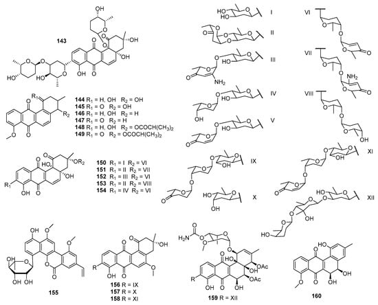 OM-4842 (143) was isolated from a soil-derived Streptomyces sp. Om-4842 (Chiba, Japan) and displayed inhibition toward doxorubicin-resistant cells of P388 at 1.5 μg/mL [] (Figure 7). Rubiginones A1 (144), A2 (145), B1 (146), B2 (147), C1 (148), and C2 (149), secondary metabolites of the soil-derived S. griseorubiginosus No. Q144-2 (Andhra Pradesh, India), displayed significant potentiated cytotoxicities against vincristine-resistant P388 cells, with IC50 values ranging within 0.007–0.23 μg/mL []. KY002 and KY40-1 were both soil-derived Streptomyces sp. discovered in the Appalachian Mountains, USA. Streptomyces sp. KY002 produced moromycin B (85), which exhibited inhibitory activities against H-460 and MCF-7 cell lines with GI50s of 5.6 and 5.6 µM, respectively []. Streptomyces sp. KY40-1 generated saquayamycins G–K (150–154) as well as the known compounds saquayamycins B1(87), A (36), and B (37), which displayed significant cytotoxicities against PC3 cells (IC50 values = 0.0075–1.759 μM) and moderate activities against H-460 cells (IC50 values = 3.30–7.28 μM) []. Polycarcin V (155) was produced by S. polyformus sp. nov. YIM 33176, which was associated with a soil sample of Vietnam, and it revealed inhibitory activities against 37 different human tumor cell lines representing 14 different solid tumor types, with the IC70 values ranging from 0.3 to 431.0 ng/mL, indicating a pronounced antitumor specificity [].