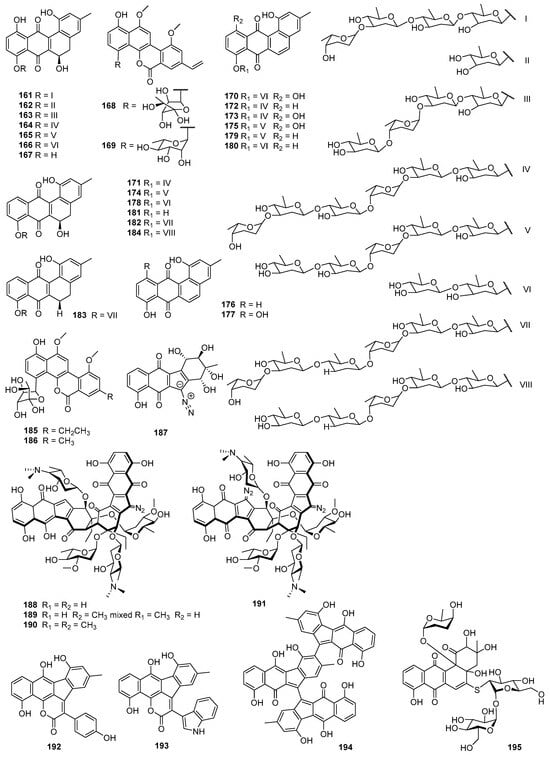 Landomycins R–W (170–175) along with tetrangulol (176) []; 5,6-anhydrolandomycinone (177) []; landomycinone (167); landomycins A (164), B (165), D (166), F (178) [], M (179) [], and O (180) []; and tetrangomycin (92) were isolated from the culture broth of S. cyanogenus S-136 []. 11-Deoxylandomycinone (181) and landomycins X–Z (182–184) were produced by the mutant strain of S. cyanogenus K62 []. These compounds showed varying degrees of cytotoxic activity toward MCF-7 (estrogen-sensitive) and MDA-MB-231 (estrogen-insensitive) cell lines. Compounds 164, 167, and 177 showed the best combined activities to both MCF-7 and MDA-MB-231 cells, with 177 for the former and 167 and 164 for the latter. Compounds 173–175 and 181–184 showed activities against MCF-7, with IC50 values of 1.0–6.7 µM, while compounds 172–175 and 181–184 could inhibit MDA-MB-231, with IC50 values of 1.2–2.5 µM. Compounds with shorter saccharidal moieties were less potent against MCF-7. The fact that most landomycins with bioactivities had either long penta- or hexasaccharide chains or no sugars at all suggests that the large molecules may act by a different mode of action compared with their small sugar-free congeners [,].