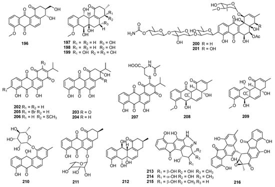 Fujianmycin C (196) was isolated from the fermentation broth of the marine actinomycetes Streptomyces sp. B6219, which was isolated from the sediment of the Galapagos mangrove (Figure 9). Fujianmycin C (196) showed weak antibacterial activity against S. viridochromogenes Tṻ57, with an inhibition zone of 14 mm at 40 μg/tablet []. Saccharothrix espanaensis AN113 was isolated from the marine mollusk Anadara broughtoni and yielded three antibiotics, saccharothrixins A–C (197–199), which displayed moderate activities against B. subtilis, E. faecium, and Xanthomonas sp. pv. Badrii at 100 μg/mL []. In the process of S. pratensis NA-ZhouS1’s culture, the addition of 100 µM nickel ion led to the production of antibacterial gypenocyclins stremycins A (200) and B (201), both of which could inhibit P. aeruginosa CMCC (B) 10104, MRSA, K. pneumonia CMCC (B) 46117, and E. coli CMCC (B) 44102 with equal MIC values of 16 µg/mL, and they showed inhibition against B. subtilis CMCC (B) 63501, with MIC values of 8–16 µg/mL. This is the first report that a new angucycline compound has been discovered through a “metal stress technique” []. The Nocardiopsis sp. HB-J378 is associated with a marine sponge Theonella sp. and produced nocardiopsistins A–C (202–204), which displayed activities against MRSA with MICs of 3.12–12.5 μg/mL. Among them, the MIC of nocardiopsistin B (203) was comparable to chloramphenicol (positive control, 3.12 μg/mL) []. The brominated nocardiopsistin D (205) and sulfur-containing nocardiopsistins E (206) and F (207) were also identified from Nocardiopsis sp. HB-J378; all of them showed anti-MRSA activities, with MICs at 0.098, 3.125, and 0.195 μg/mL, respectively. The single bromination in 205 drastically enhanced the anti-MRSA activity by 128-fold, and it acquired activities against vancomycin-resistant S. aureus (VRSA), E. faecium, and B. cereus [].