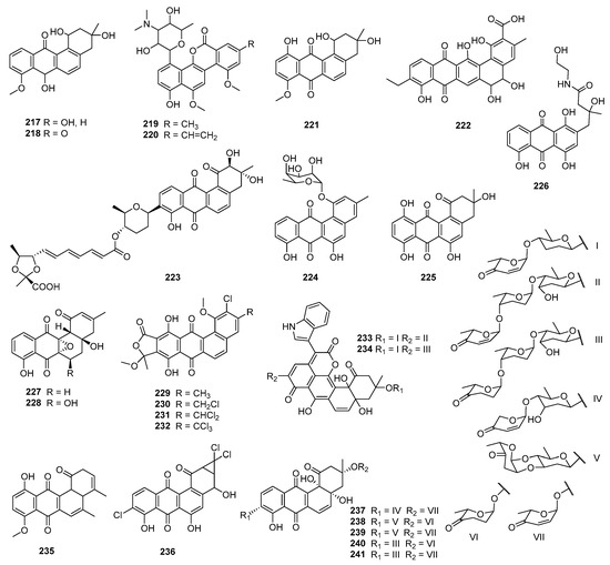 A Saharan soil-derived actinobacterium PAL114 (Mzab region, southern Algeria) produced mzabimycins A (233) and B (234), which contained L-tryptophan and glucoside derivatized chromophore on account of the addition of L-tryptophan in the fermentation; both of them exhibited antibacterial activities against M. flavus ATCC 9314 and L. monocytogenes ATCC 13932, with MIC values ranging from 15 to 40 μg/mL []. Based on a bioassay-guided isolation, 235 was discovered from the stem bark extracts of Stereospermum fimbriatum and exhibited bioactivities against S. epidermidis ATCC 12228, MRSA, and S. aureus ATCC 25923, with MIC values of 3.13–6.25 μg/mL []. Actinomycetes strain RI104-LiC106, associated with lichen, generated a 1,1-dichlorocyclopropane-containing angucycline, JBIR-88 (236), which exhibited antibacterial activity against M. luteus when the paper contained 25 μg of the compound (inhibition zone, 11mm) []. A soil-derived Streptomyces sp. TK08046 (Shizuoka, Japan) was the producer of saprolmycins A–E (237–241), which displayed inhibition against Saprolegnia parasitica, with respective MICs of 0.0039, 8, 1, 1, and 0.0078 µg/mL. Compound 241 could also inhibit S. aureus, B. subtilis, and Daphnia pulex, with MICs at 15.6, 7.8, and 4.5 µg/mL, respectively []. S. griseus NTK 97 was isolated from a terrestrial sample of Terra Nova Bay at Edmondson Point, Antarctica and was the producer of frigocyclinone (136), which could inhibit B. subtilis DSM 10 and S. aureus DSM 20231, with MICs of 10 and 33 μM, respectively (positive control vancomycin and erythromycin, MICs = 1 μM) [].