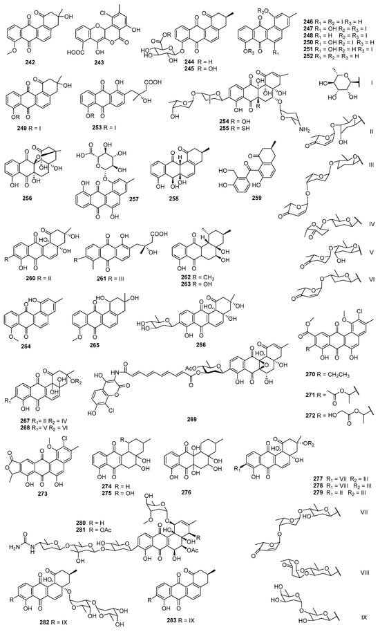 6-Deoxy-8-O-methylrabelomycin I (242), produced by S. tsusimaensis MI310-38F7, showed inhibitory activities against various Gram-positive bacteria (S. aureus Smith, multi-resistant S. aureus MS9610, M. luteus PCI 1001, and B. subtilis NRRLB-558), with MIC values between 12.5 and 25.0 μg/mL, but it displayed no activity against Gram-negative bacteria [] (Figure 11). Ecological cultivation of Actinomadura sp. RB29 and mass spectral-mediated molecular network analysis led to the expression of a silent gene cluster and the discovery of maduralactomycin A (243), which exhibited moderate activities against VRE (few colonies in the inhibition zone, 13 mm) and M. vaccae (12 mm) using the broth dilution method []. Acidonemycins A (244) and B (245) were discovered from the acidic culture (pH 5.4) of S. indonesiensis DSM 41759 and exhibited in vitro antivirulence activities against MRSA. Both compounds could inhibit the production of PSM and the formation of biofilm but not a significant growth inhibition. Further study indicated that the PSM and biofilm inhibitory activities of 244 and 245 were due to the (+)-ochromycinone aglycone moiety [].