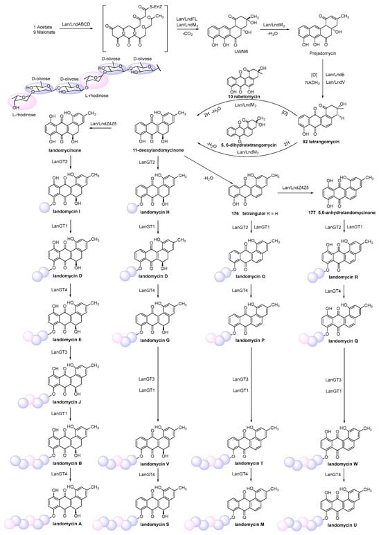 - Luzhetskyy, A.; Taguchi, T.; Fedoryshyn, M.; Dürr, C.; Wohlert, S.E.; Novikov, V.; Bechthold, A. LanGT2 Catalyzes the First Glycosylation Step during landomycin A biosynthesis. Chembiochem. 2005, 6, 1406–1410. [Google Scholar] [CrossRef]