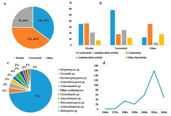 Nature has always been a significant source in the history of drug discovery, and the ocean has long been recognized as a reservoir of numerous lead compounds owing to its unique environment []. Over the past two decades, a substantial number of new marine natural products (MNPs) have been discovered []. Among them, over 45% of bioactive molecules sourced from microorganisms are produced by actinomycetes []. As the most well-known genus of actinomycetes, Streptomyces continues to yield a great diversity of novel bioactive compounds with varied chemical structures. Increasing evidence suggests that Streptomyces spp. are prolific producers of secondary metabolites with antibacterial/antifungal [], anticancer [], anti-neuroinflammatory [], and anti-α-glucosidase [] activities.