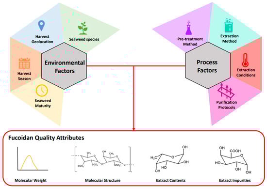 The quality of industrial fucoidan products is heavily affected by an incredibly wide range of factors, including biological and environmental aspects, as well as process-related factors (Figure 1).