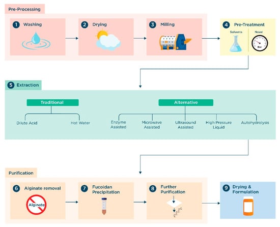 Schematic overview of a typical bioprocess for the production of fucoidans from brown seaweed.
