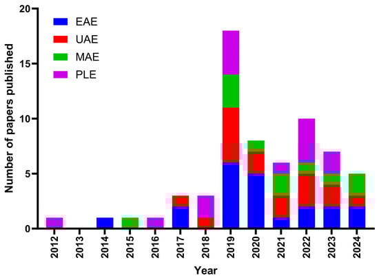 Number of papers published per year that were considered in this review. Enzyme-assisted extraction (EAE), ultrasound-assisted extraction (UAE), microwave-assisted extraction (MAE) and pressurized liquid extraction (PLE).