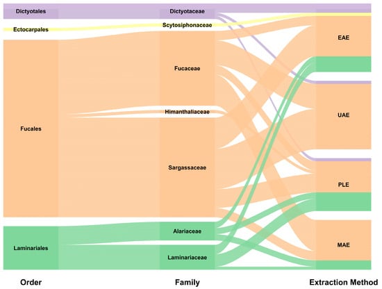 Figure 4 depicts the taxonomical distribution of brown seaweeds in the literature selected. The orders Fucales and Laminariales dominate the literature landscape due to a combination of their abundance in nature as well as their relatively high fucoidan content [62]. Over 50% of the seaweed employed in all different extraction methods belongs to Fucales. Within this order, three families are represented, again, with their prevalence closely matching their global distribution: Sargassaceae, followed by Fucaceae and a small quantity of Himanthaliaceae [63,64]. Laminariales species have also been tested using most of the extraction methods except for UAE. Two families represent this order, Laminariaceae and Alariaceae, also aligning with their global prevalence [65]. A small number of papers used kelps from the orders Dictyotales and Ectocarpales. Despite the relatively small presence of Dictyotales and Ectocarpales, they have been tested across the range of alternative extraction techniques. Notably, EAE was applied to virtually all of the taxonomical orders considered. In short, the selected literature provides a globally representative snapshot of the various taxonomical orders and families used for fucoidan extraction. The absence of bias, both in terms of seaweed species considered and in terms of extraction method employed, strengthens the value of the comparisons and conclusions that will follow in this review paper.