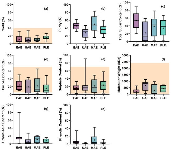 In the next sections, focus is placed on alternative techniques due to their reduced energy and solvent consumption compared to traditional methods. A systematic method of data collection from the existing literature was employed. First, a broad Scopus search was conducted using fucoidan and extraction as keywords, followed by filtering to identify all papers that carried out fucoidan extraction using one of the four alternative extraction techniques here considered. Further, papers selected for this review had to directly or indirectly state the extraction conditions employed, as well as provide qualitative or quantitative data of the extracted fucoidan. In instances where data were unclear or missing, reasonable assumptions were made to allow for data to be extrapolated. This approach allowed for the collation of a complete and current data set for each of the four extraction methods. The data collected were tabulated and summarized into boxplots (Section 6.1) to enable direct the comparison and identification of trends across the different extraction methods, with emphasis on alternative techniques. Literature data were standardized to specific descriptors to enable comparison between extraction methods: