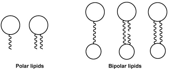 Bipolar natural compounds with polar fragments, located at both ends of the hydrophobic chain (or such chains) connecting them to each other, form a class of natural products known both as structural components of biomembranes and as bioregulators. Schematically, the structures of polar and bipolar lipids are usually shown by pictograms, in which the polar fragments are depicted in circles and the nonpolar “tails” are represented by sinuous lines (Figure 1). Sometimes, some bipolar metabolites with long and flexible chains are called bolalipids, or more generally as “bolaamphiphilic molecules”, deriving from the “bola”—a hunting weapon of the South American residents for throwing at animals. Bolas can wrap themselves around the front legs or neck of animals and help to catch them [1].
