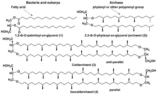 1,2-Di-O-palmitoyl-sn-glycerol (1) of bacteria and eukarya, diether (2), and tetraether (3, 4) lipids of archaea.