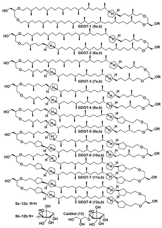 GDGTs 5a–12a and glycerol-calditol bipolar lipids 5b–12b and calditol (13).