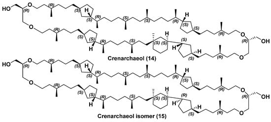Crenarchaeol (14) and crenarchaeol isomer (15); both structures are shown for parallel conformations.